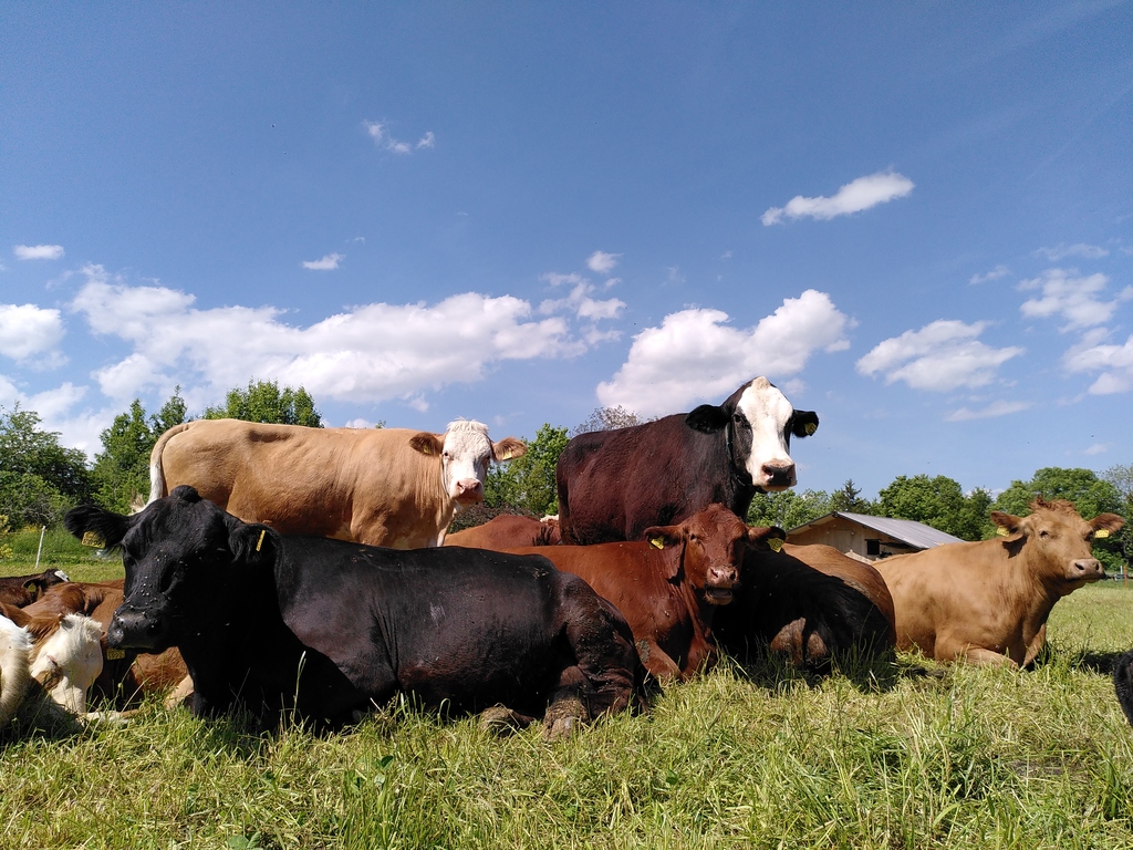 - 19 Mutterkühe mit Stier. Eine bunt gemischte Herde mit Angus, Simmental,